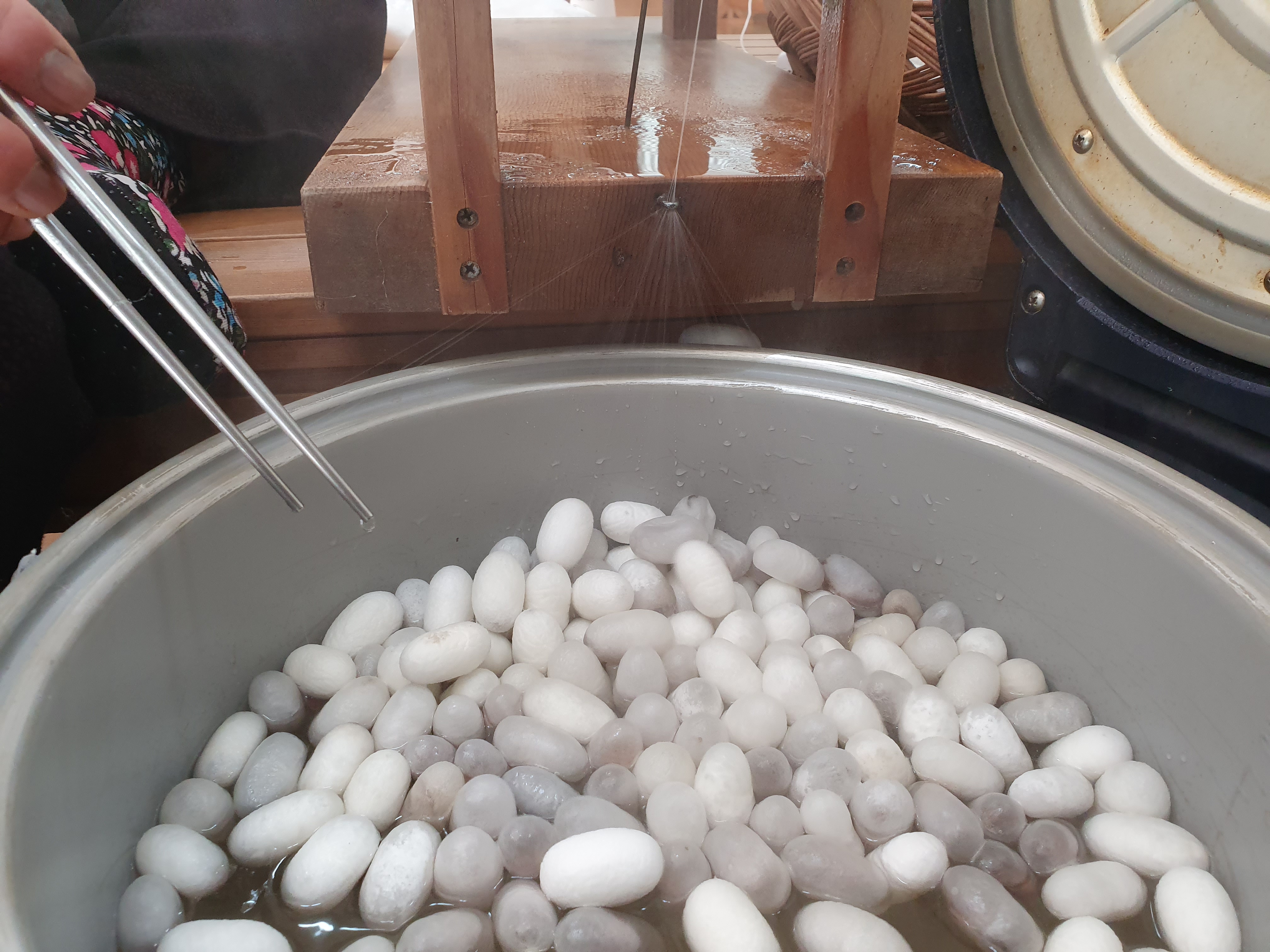 누에고치를 물로 삶고 젓가락으로 휘휘 저으면 위 사진처럼 누에 실끼리 붙고, 그걸 적당한 굵기로 뽑아내서 물레로 뽑아내면 실이 됩니다! 반투명해진 고치는 실을 다 뽑아낸거라서 꺼내게 됩니다. 그 속에 번데기가 있는데, 먹어볼 수 있습니다! 조미하지 않아서 담백한 맛이더라고요~
