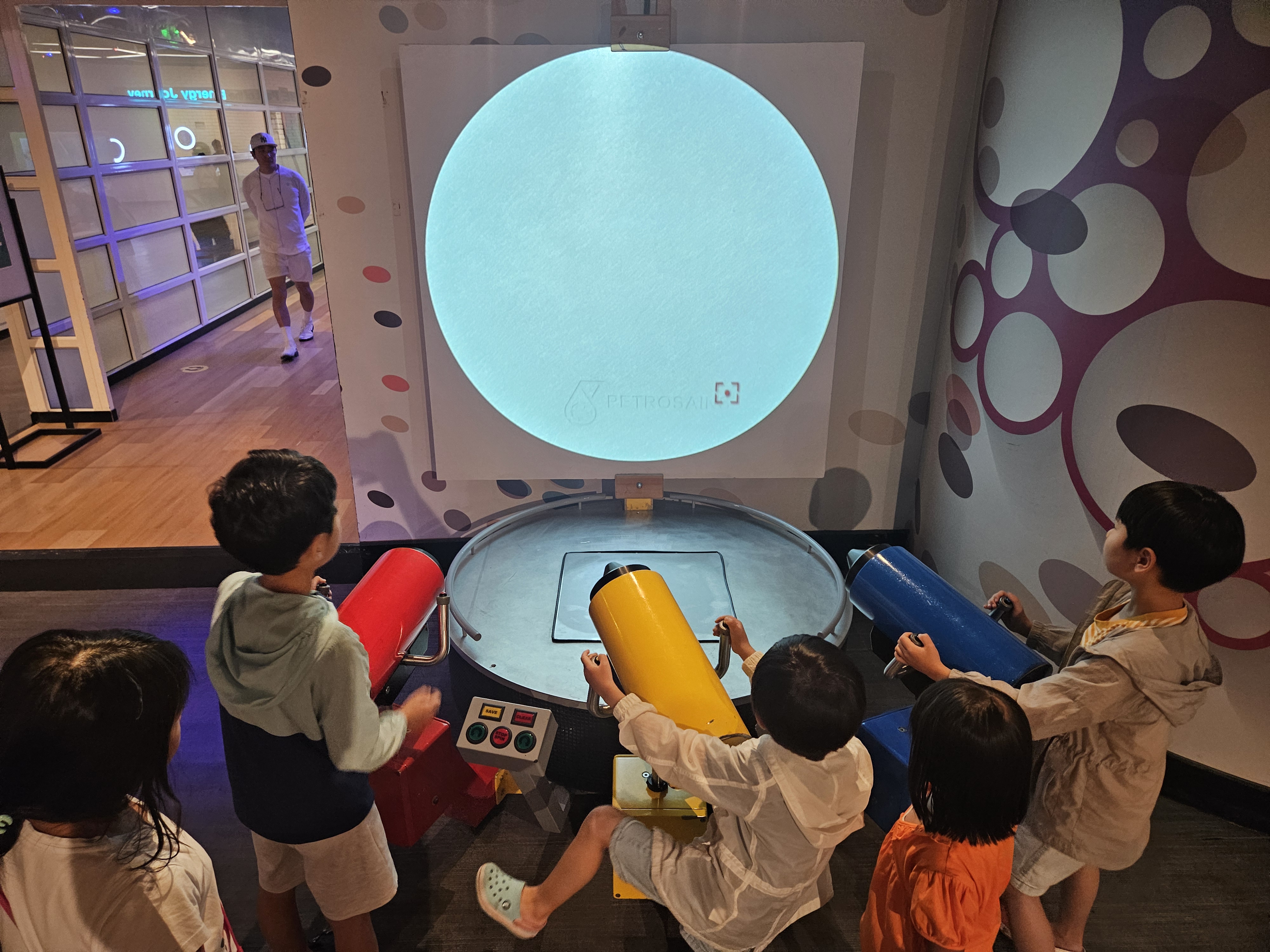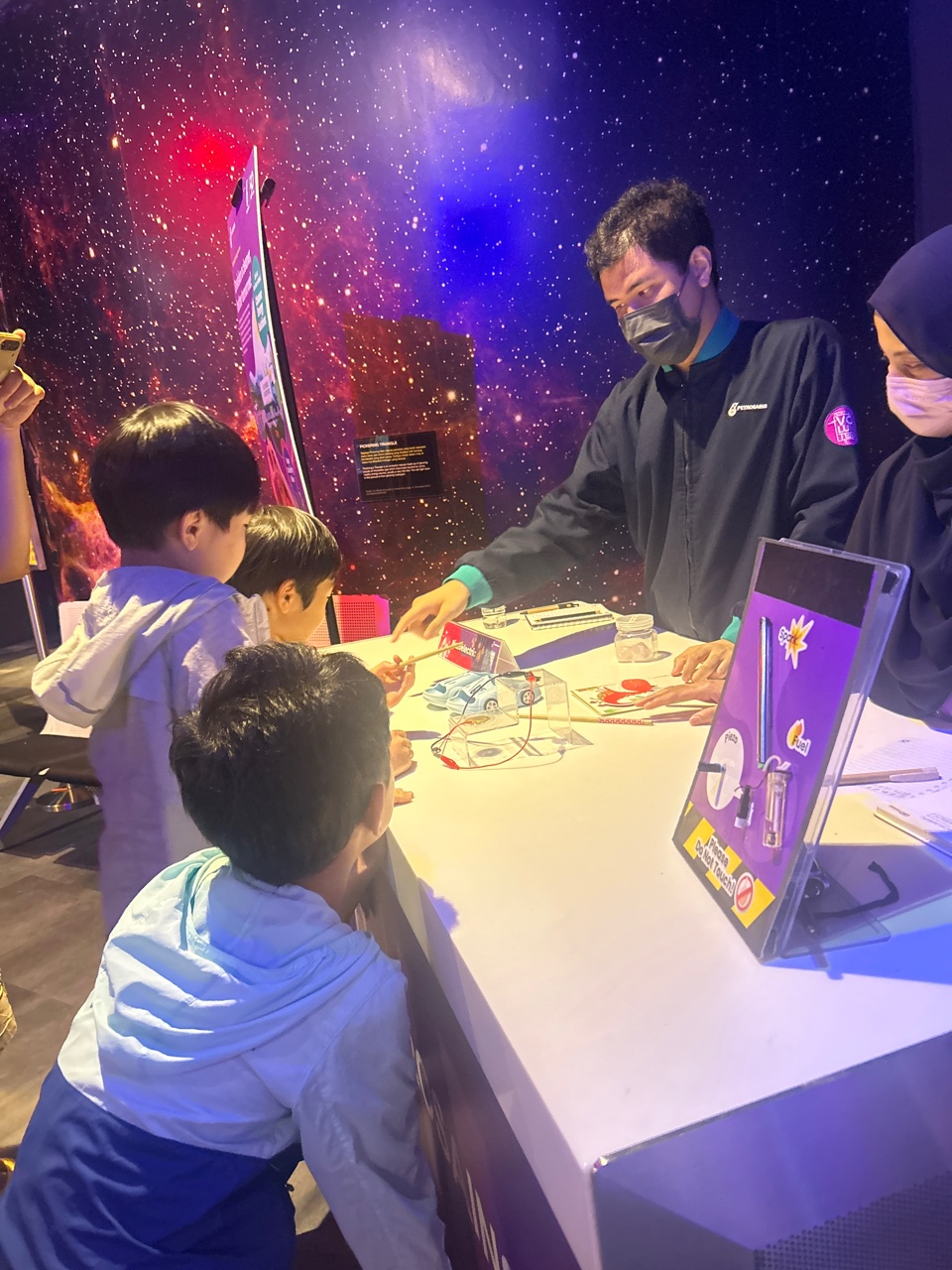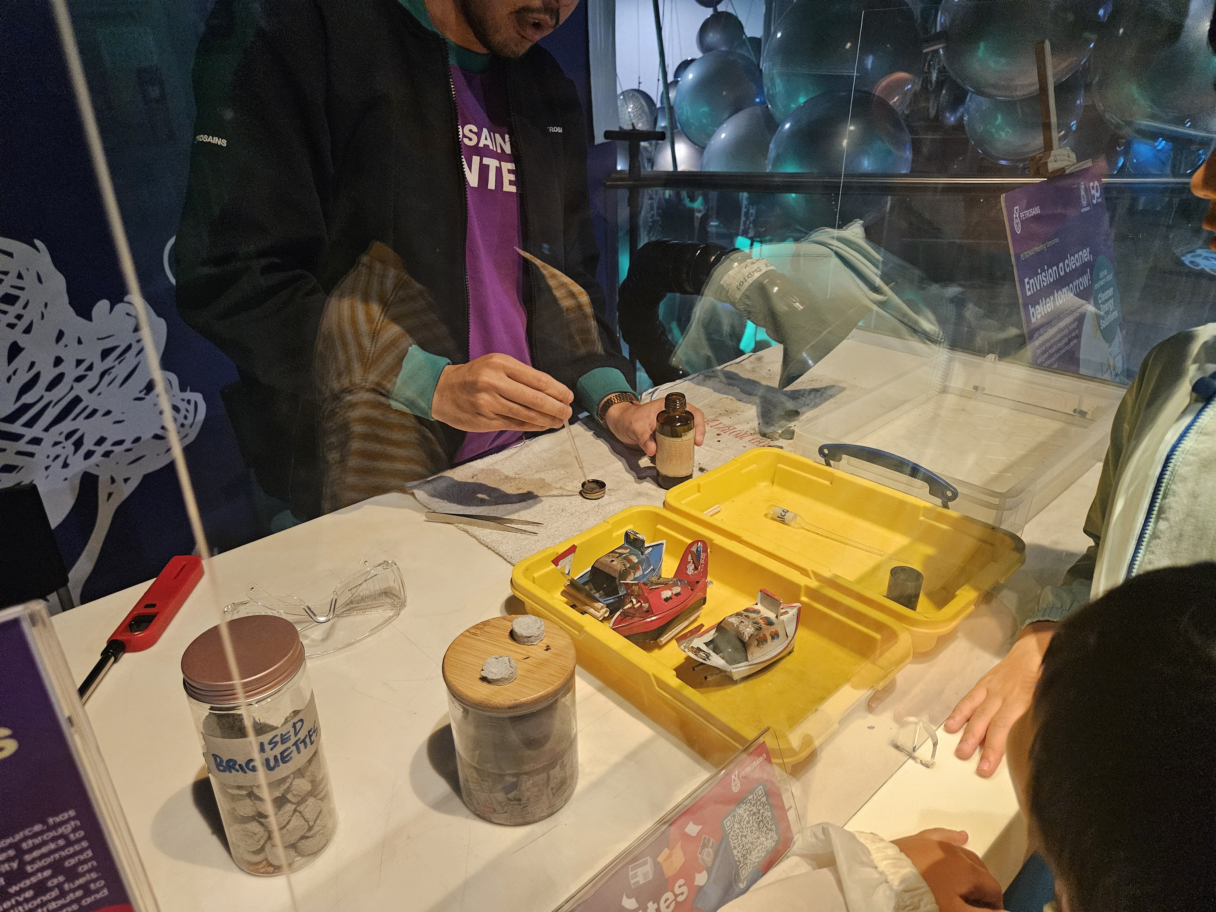 그다음은 Molecule Nano World입니다. 2층으로 올라가게 되는데요, 먼저 만나는 건 배에 불을 붙여서 배가 앞으로 나아가게 만드는 체험입니다. 페트로나인스는 곳곳에 간단한 실험을 할 수 있는 체험존이 몇 군데 설치되어 있었는데, 그게 또 아이들의 흥미를 끄는 것 같아서 좋았어요!